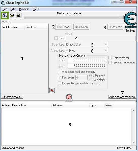 Before we can start our fun, I’ll explain to you some of the important parts of the Cheat Engine GUI.